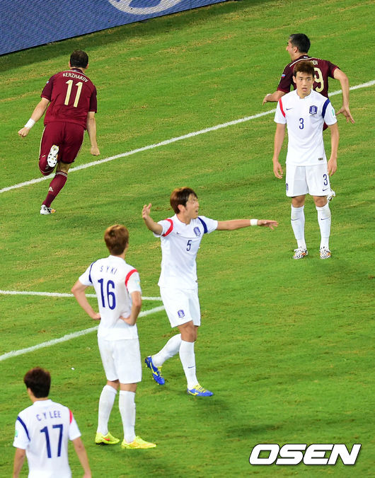 후반 한국 선수들이 러시아 케르자코프에 동점골을 허용하며 아쉬워하고 있다.