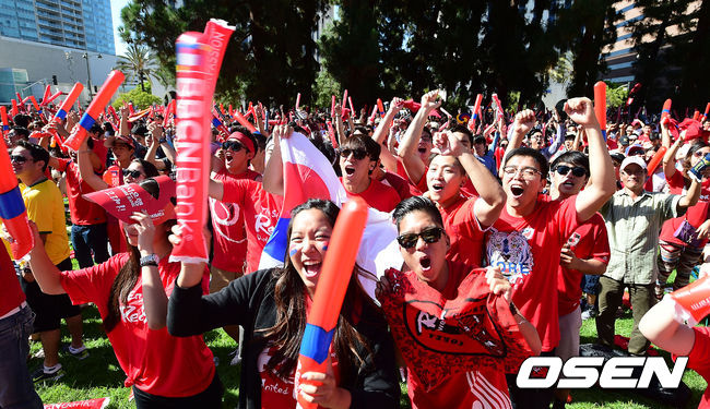18일(한국시간) 미국 캘리포니아주 LA 한인타운내 위치한 윌셔 팍 플레이스 잔디광장에서 2014 브라질 월드컵 H조 대한민국과 러시아의 경기를 응원하기 위해 교민들이 모였다.