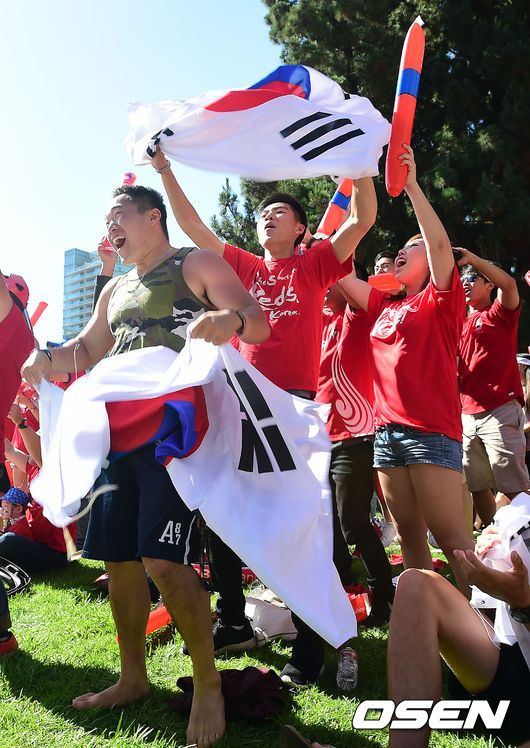 18일(한국시간) 미국 캘리포니아주 LA 한인타운내 위치한 윌셔 팍 플레이스 잔디광장에서 2014 브라질 월드컵 H조 대한민국과 러시아의 경기를 응원하기 위해 교민들이 모였다.