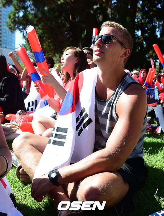 18일(한국시간) 미국 캘리포니아주 LA 한인타운내 위치한 윌셔 팍 플레이스 잔디광장에서 2014 브라질 월드컵 H조 대한민국과 러시아의 경기를 응원하기 위해 교민들이 모였다.