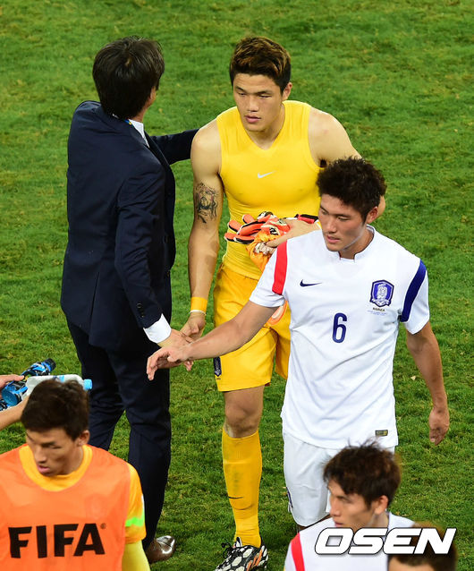 경기후 한국 홍명보 감독이 정성룡을 격려하고 있다. /rumi@osen.co.kr