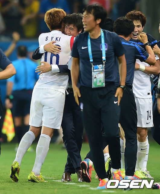 후반 기성용의 골이 터지자 기성용이 홍명보 감독에게 달려가 안기고 있다. /rumi@osen.co.kr