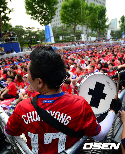 한국과 러시아의 2014 FIFA 월드컵 첫 경기가 펼쳐진 18일 오전 서울 삼성동 코엑스 사거리 영동대로에서 진행된 길거리 응원전, 시민들이 붉은 악마의 지휘에 맞춰 열심히 응원하고 있다.