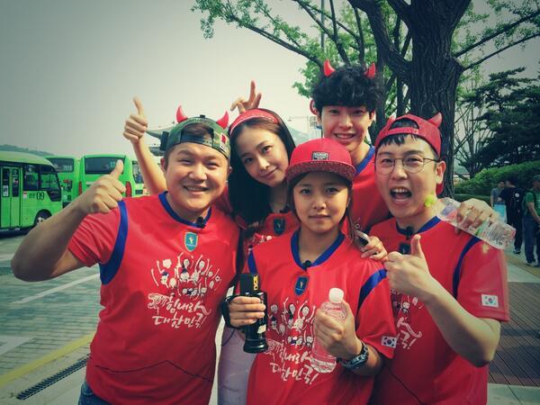18일 오전 광화문에서 거리응원을 펼친 룸메이트 멤버 조세호, 홍수연, 송가연, 박민우 등은 “오늘 멋진 경기 보여준 우리 선수들에게 엄지손가락을 치켜세우며! 다음 알제리, 벨기에전도 파이팅하~세호! 대~한민국~! 짝짝짝짝짝!” 이라는 글과 함께 붉은 티셔츠를 입고 응원을 막 끝내 사진을 게재했다.