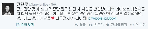 전현무는 18일 오전 자신의 트위터를 통해 “평가전만 몇 개 보고 걱정만 잔뜩 했던 제 자신을 반성합니다^^ 라디오로 애청자들과 함께 응원하며 좋은 기운을 브라질로 많이많이 날렸어요! 이 정도 경기력이면 벨기에도 별거 아닐 듯. 태극전사여~파이팅!”이라는 글로 러시아전에 대한 소감과 함께 오는 27일에 열리는 벨기에전에 대한 기대도 드러냈다