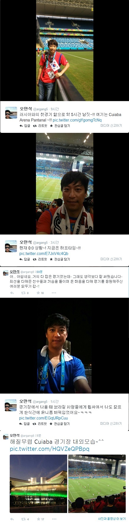 [OSEN=안보겸 인턴기자] 배우 오만석이 브라질에서 치러진 한국 대표팀의 1차전 경기를 자신의 트위터를 통해 생중계했다.