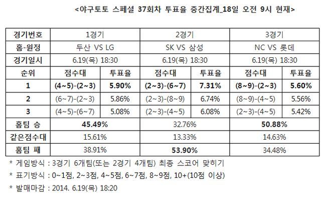 KBO 3경기 대상 야구토토 스페셜 37회차 투표율 중간집계