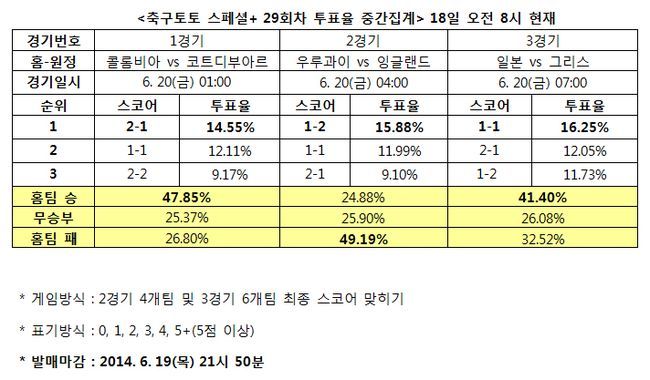 2014 브라질 월드컵 조별예선 3경기 대상 축구토토 스페셜+ 29회차 투표율 중간집계 결과