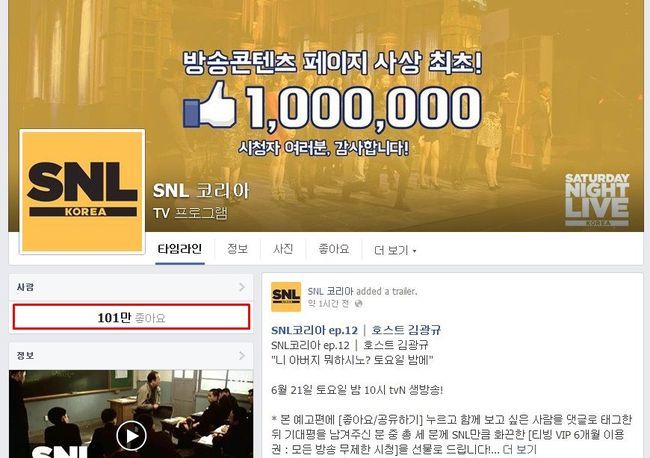 tvN 측은 1“시즌4까지 53만 팬을 보유하고 있던 ‘SNL’ 페이스북이 이번 시즌5 방송 시작 약 3개월 만에 50만 팬을 추가 확보하는데 성공하며 100만 명을 기록했다”고 18일 밝혔다. 이는 국내 방송 프로그램 공식 계정 사상 최초이자 최고 기록이다.