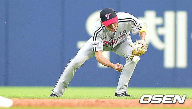 3회말 두산 공격 선두타자로 나선 김현수의 땅볼 타구를 LG 2루수 김용의가 더듬는 실책을 범하고 있다. 타자주자는 1루까지.