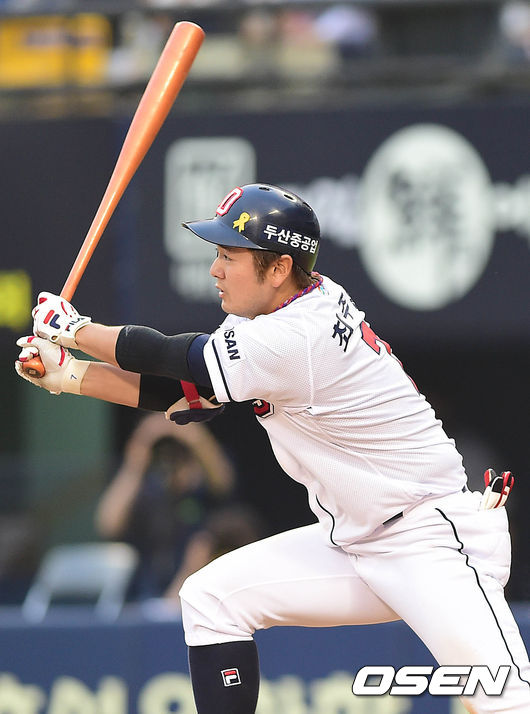 3회말 두산 공격 1사 만루 상황 최주환이 우중간 2타점 적시 2루타를 날리고 있다.