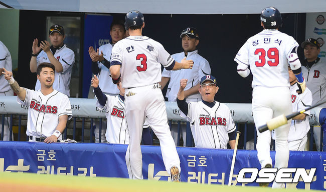 3회말 두산 공격 1사 만루 상황 최주환의 우중간 2타점 적시 2루타 때 홈을 밟은 칸투와 장민석이 송일수 감독을 비롯한 코칭스태프, 더그아웃 동료들과 인사를 나누고 있다.