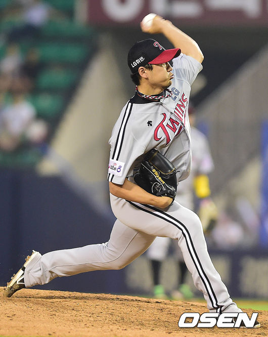 4회말 두산 공격 때 LG 투수 신재웅이 힘차게 공을 뿌리고 있다.