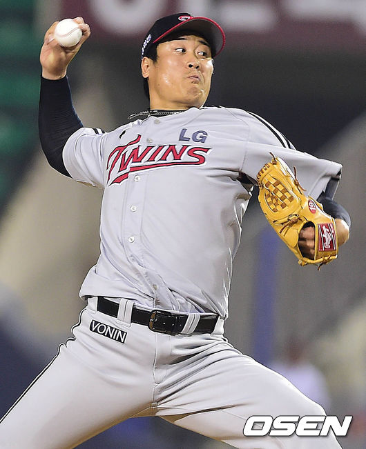 5회말 두산 공격 1사 1, 2루 상황 마운드에 오른 LG 투수 정현욱이 힘차게 공을 뿌리고 있다.