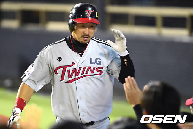 7회초 LG 공격 2사 만루 상황 이병규가 역전 중월 만루포를 터트리고 홈을 밟은 뒤 더그아웃 동료들과 인사를 나누고 있다.