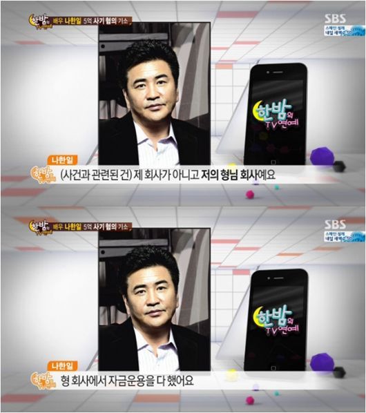 나한일은 18일 방송된 SBS 연예정보프로그램 ‘한밤의 TV연예’에서 “(문제가 된 회사가) 형이 운영하는 회사”라면서 “형의 회사를 지인에게 소개를 했고 내가 연대보증을 했다. 형 회사에서 자금운용을 했는데 몰랐다”고 해명했다.