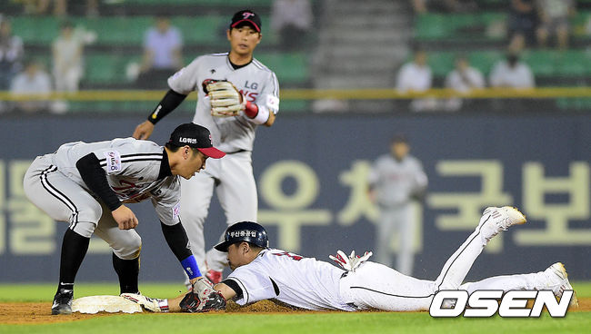 8회말 두산 공격 무사 1루 상황 장민석 타석 때 오재원이 2루 도루에 성공하고 있다.
