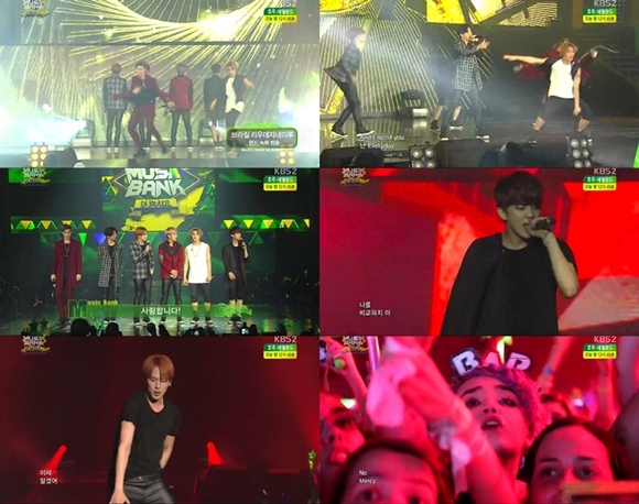 B.A.P는 18일 오후 녹화 방송된 KBS 2TV '뮤직뱅크 인 브라질'에서 '1004'와 '노 머시(No Mercy)' 등의 무대를 꾸몄다.