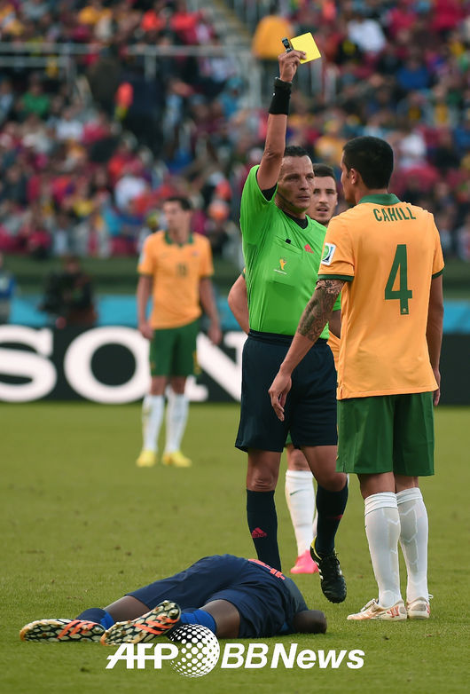 전반 호주 케이힐이 네덜란드 브루노 마르틴스 인디에게 파울을 범하며 경고를 받고 있다.