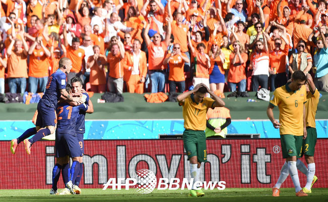 네덜란드는 19일(이하 한국시각) 브라질 포르투 알레그레의 에스타디오 베이라리오에서 열리는 2014 브라질월드컵 B조 2차전 경기서 3-2 승리를 거두고 2승(승점 6)으로 조 1위를 유지, 사실상 16강 진출을 확정지었다. 반면 호주는 2패로 탈락에 한 걸음 더 가까워졌다.