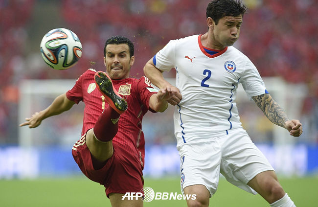 스페인 페드로가 칠레 메나에 앞서 볼을 차지하고 있다.