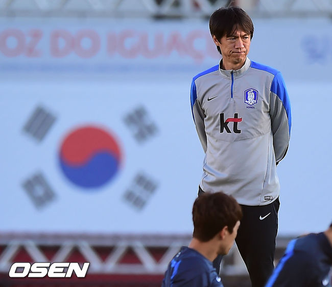 19일 오전(이하 한국시간) 홍명보 감독이 이끄는 축구국가대표팀이 브라질 이구아수의 페드로 바소경기장에서 회복 훈련을 가졌다. 홍명보 감독이 선수들의 훈련을 바라보고 있다.