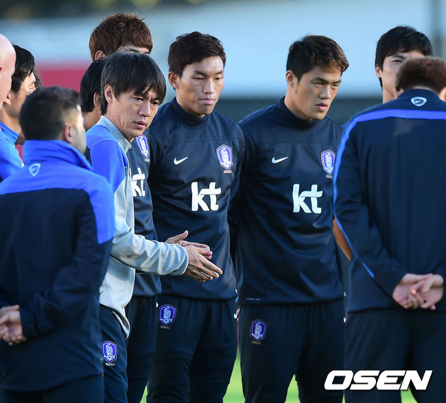 19일 오전(이하 한국시간) 홍명보 감독이 이끄는 축구국가대표팀이 브라질 이구아수의 페드로 바소경기장에서 회복 훈련을 가졌다. 홍명보 감독이 선수들과 미팅을 갖고 있다.