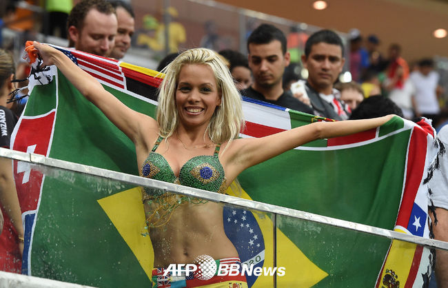브라질 미녀 팬이 경기에 앞서 열띤 응원을 하고 있다.