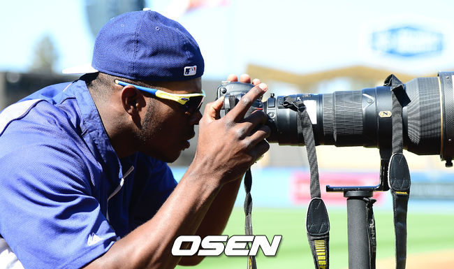 16일(한국시간) 미국 캘리포니아주 로스앤젤레스 다저스타디움에서 열리는 '2014 메이저리그' LA 다저스와 콜로라도 로키스의 경기가의 앞서 LA 다저스 푸이그가 취재진의 카메라의 관심을 갖고 사진을 촬영하고 있다.