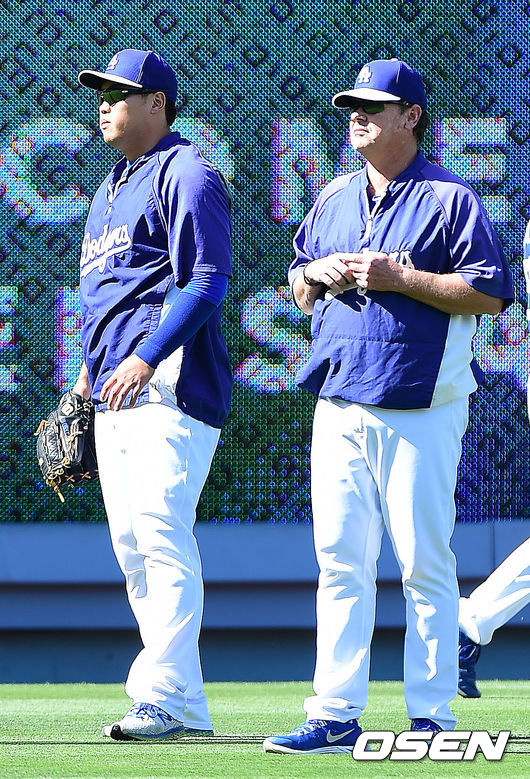 16일(한국시간) 미국 캘리포니아주 로스앤젤레스 다저스타디움에서 열리는 '2014 메이저리그' LA 다저스와 콜로라도 로키스의 경기에 앞서 LA 다저스 허니컷 코치가 류현진의 훈련을 바라보고 있다.