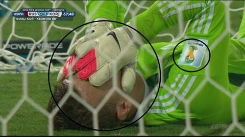 [OSEN=선수민 인턴기자] 한국의 브라질 월드컵 첫 골을 도왔던 러시아 수문장 이고르 아킨페예프(28, CSKA 모스크바)의 월드컵 로고와 비슷한 절망 포즈가 눈길을 끈다.
