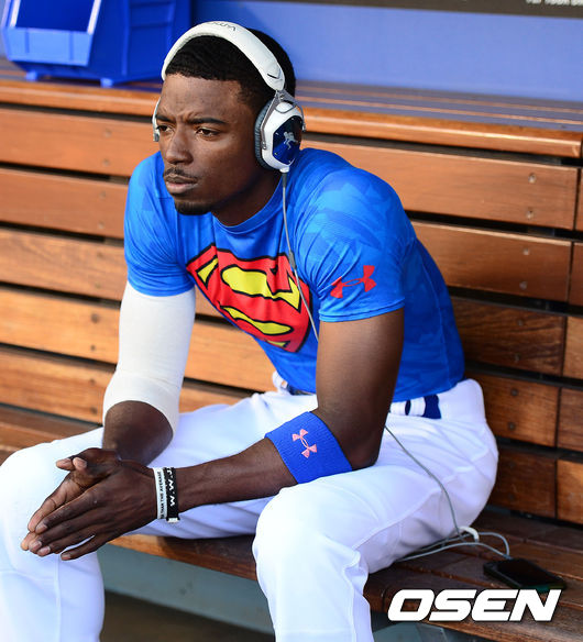 경기 시작전 다저스 디 고든이 음악을 듣고 있다.