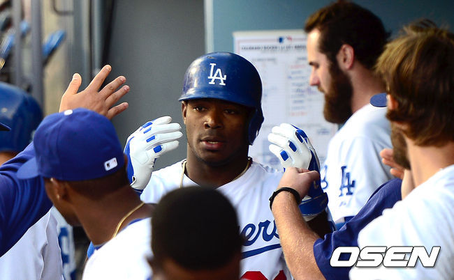 1회말 무사 2,3루 다저스 푸이그가 중견수 희생플라이로 타점을 올린 뒤 동료들과 기뻐하고 있다.