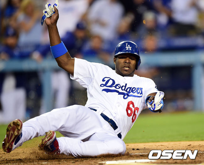3회말 2사 1루 다저스 푸이그가 곤잘레스의 안타로 득점을 올리고 있다.