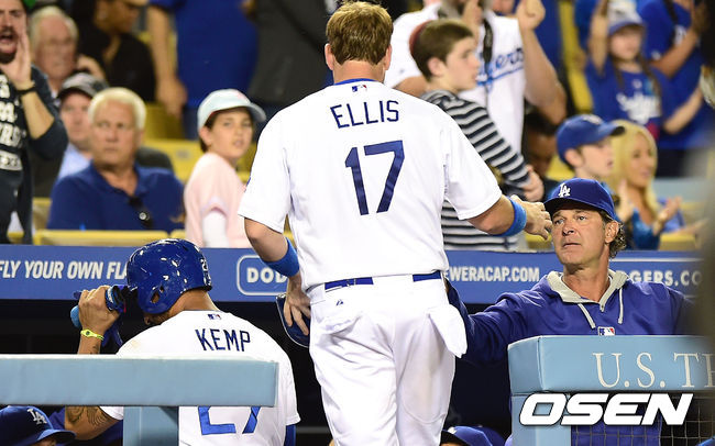 다저스 돈 매팅리 감독이 3회말 2사 만루 다저스 로하스의 적시타로 득점을 올린 다저스 A.J 엘리스, 켐프와 하이파이브를 하고 있다.