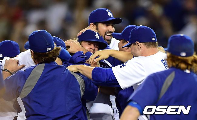 노히트 노런을 달성한 LA 다저스 클레이튼 커쇼가 동료들과 기뻐하고 있다./youngrae@osen.co.kr