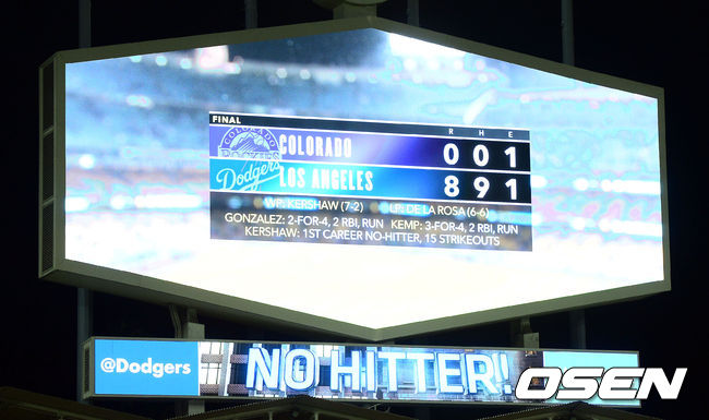 [OSEN=다저스타디움(LA 미국 캘리포니아주), 곽영래 다저스 에이스 클레이튼 커쇼가 생애 첫 노히트 노런의 대기록을 세웠다. 내야수 실책이 없었다면 퍼펙트 게임도 가능한 경기였다.