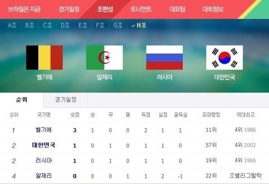한편, 월드컵 H조 순위를 접한 누리꾼들은 "월드컵 H조 순위, 똥줄 탄다" "월드컵 H조 순위, 알제리전 잘해야할텐데" "월드컵 H조 순위 압박감 장난아니겠다" "월드컵 H조 순위, 대한민국 응원합니다" 등의 반응을 보였다.