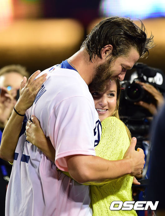 노히트 노런을 달성한 LA 다저스 클레이튼 커쇼가 아내인 엘렌 커쇼와 포옹을 하고있다./youngrae@osen.co.kr