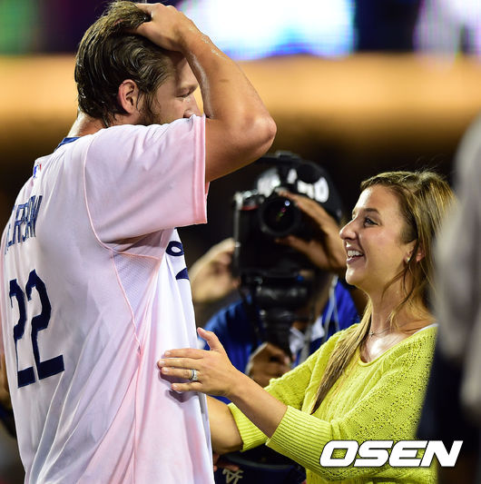 노히트 노런을 달성한 LA 다저스 클레이튼 커쇼가 아내인 엘렌 커쇼와 포옹을 하고있다./youngrae@osen.co.kr