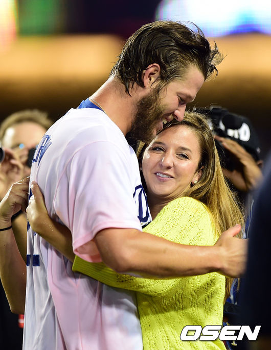 노히트 노런을 달성한 LA 다저스 클레이튼 커쇼가 아내인 엘렌 커쇼와 포옹을 하고있다./youngrae@osen.co.kr