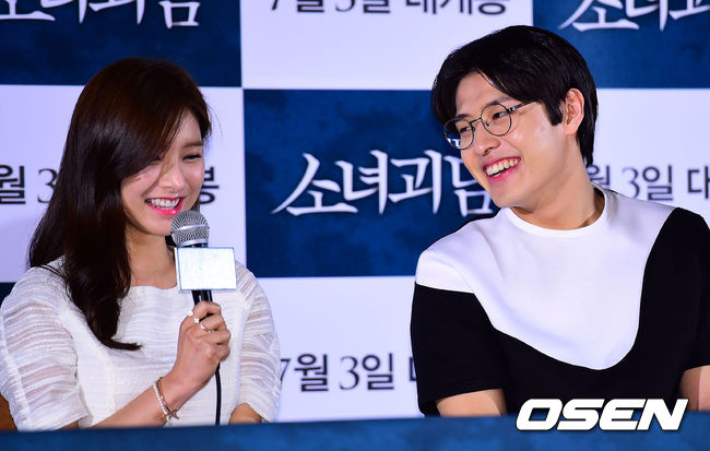 19일 오후 서울 동대문 메가박스에서 진행된 영화 '소녀괴담'(감독 오인천) 언론배급시사회에서 강하늘이 김소은을 바라보며 미소짓고 있다.
