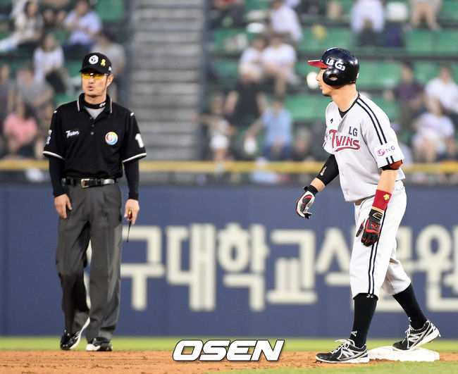 19일 오후 서울 잠실구장에서 열린 '2014 한국야쿠르트 세븐 프로야구' 두산베어스와 LG 트윈스의 경기, 5회초 선두타자 손주인 좌월솔로 홈런을 날리고 2루에서 멈췄다가 그라운드를 돌고 있다.