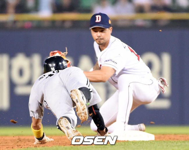 19일 오후 서울 잠실구장에서 열린 '2014 한국야쿠르트 세븐 프로야구' 두산베어스와 LG 트윈스의 경기, 5회초 2사 1루 이진영의 내야안타때 1루 주자 정성훈 2루에서 오버런 귀루하다 두산 오재원에게 태그아웃 처리되고 있다.
