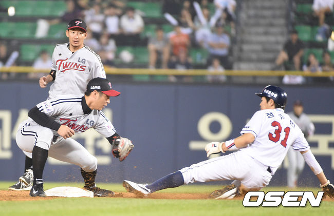 19일 오후 서울 잠실구장에서 열린 '2014 한국야쿠르트 세븐 프로야구' 두산베어스와 LG 트윈스의 경기, 5회말 1사 1루 김현수 타석때 1루주자 정수빈 2루 도루에 성공하고 있다.