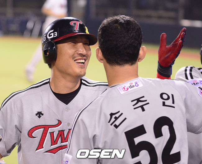19일 오후 서울 잠실구장에서 열린 '2014 한국야쿠르트 세븐 프로야구' 두산베어스와 LG 트윈스의 경기, 7회말 2사 1루 이진영 좌월투런 홈런을 날리고 손주인과 기쁨을 나누고 있다.