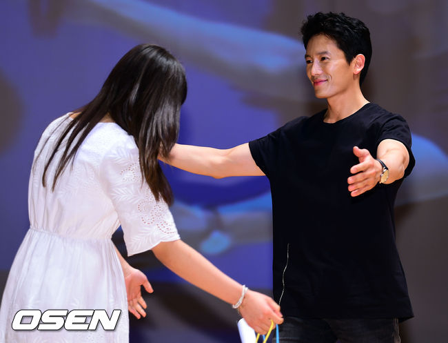 19일 오후 서울 성신여대 미아운정 그린캠퍼스에서 진행된 영화 '좋은 친구들' 쇼케이스에서 지성이 팬과 함께 포옹을 나누고 있다.