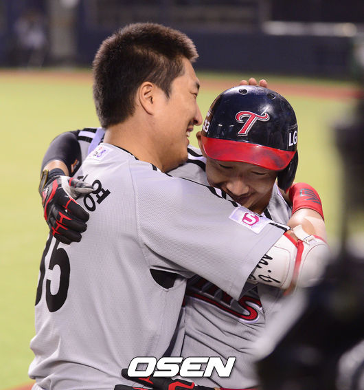 19일 오후 서울 잠실구장에서 열린 '2014 한국야쿠르트 세븐 프로야구' 두산베어스와 LG 트윈스의 경기, 5회초 선두타자 손주인 좌월솔로 홈런을 날리고 홈인 이진영으로 부터 축하를 받고 있다.