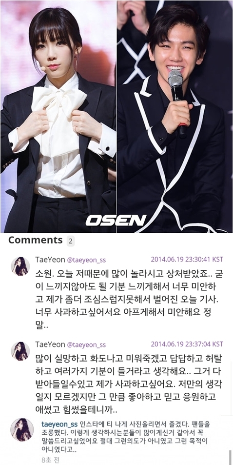 그룹 소녀시대 태연이 엑소 백현과의 열애에 대해 입을 열었다. 개인 SNS에 올린 사진과 글들이 뒤늦게 백현과의 열애 증거로 알려진 것에 대한 해명과 팬들에 대한 미안한 마음을 전했다.