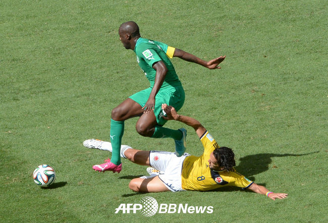 코트디부아르 야야 투레가 콜롬비아 아벨 아길라르의 태클을 피해 드리블하고 있다./ photo@osen.co.kr < 사진 > ⓒAFPBBNews = News1